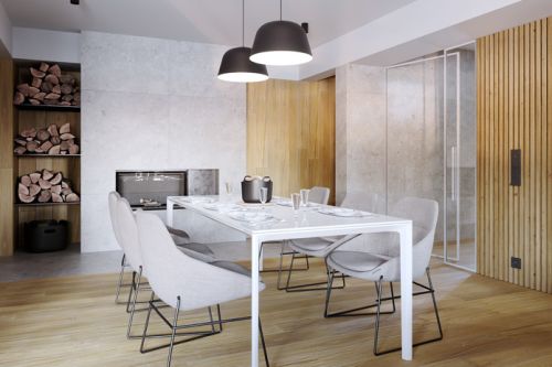 Ústředním bodem domu je obývací pokoj spojený s jídelnou a kuchyňským koutem. Jídelně dominuje velký bílý moderní stůl s pohodlnými čalouněnými židlemi a krb opatřený stěrkou. V obývací části je jasně žlutá rohová pohovka s nastavitelnými opěrkami hlavy, která barevně oživuje interiér. Televizní stěna je obložena stejným kamenným obkladem, který se vyskytuje v exteriéru. Kuchyňský kout je materiálově tvořen svěží kombinací betonu, dřeva a bílé barvy. Kuchyňský ostrůvek tvoří dělící linii mezi kuchyní a obývacím pokojem, kde slouží jako barový pult doplněný moderními barovými židličkami v hnědé kůži.